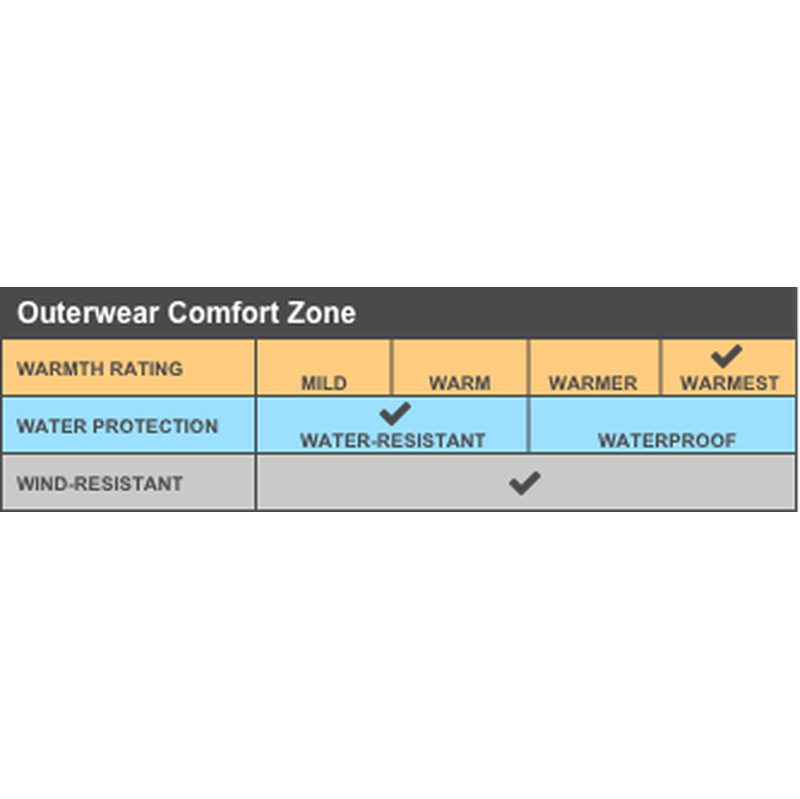 • Inner jacket: molded center front zipper, zippered hand pockets, binding at hem and cuffs